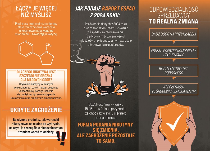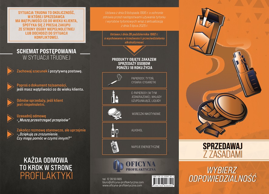 Odpowiedzialna sprzedaż wyrobów tytoniowych i nikotynowych wiąże się z bezwzględnym zakazem oferowania ich osobom niepełnoletnim. Równie ważne jest stałe uświadamianie sprzedawców w zakresie obowiązujących przepisów, aktualizacji prawa oraz wspieranie ich wiedzy na temat profilaktyki i przeciwdziałania uzależnieniom. Dzięki broszurze sprzedawcy dowiedzą się, które produkty objęte są zakazem sprzedaży, jak prawidłowo reagować w sytuacjach trudnych, a także dlaczego nikotyna jest szczególnie groźna dla młodych osób. Publikacja podkreśla istotną rolę odpowiedzialności w codziennej pracy sprzedawcy, pokazując, że profilaktyka lokalnej społeczności może zaczynać się właśnie w punktach sprzedaży.