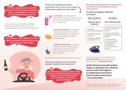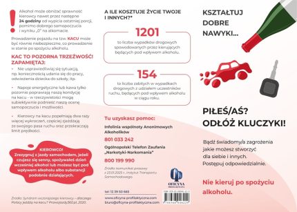 Broszura skierowana do osób dorosłych, przestrzega przed nieodpowiedzialnym zachowaniem na drodze, w związku z kierowaniem pojazdami po spożyciu alkoholu lub substancji podobnie działających. Materiał profilaktyczny poza obowiązującymi konsekwencjami prawnymi wynikającymi z nieprzestrzegania przepisów, zawiera rzetelne informacje i statystyki dotyczące wpływu substancji psychoaktywnych na użytkowników dróg, a także w wiarygodny sposób podważa mity dotyczące manipulowania wynikami testu alkomatem.