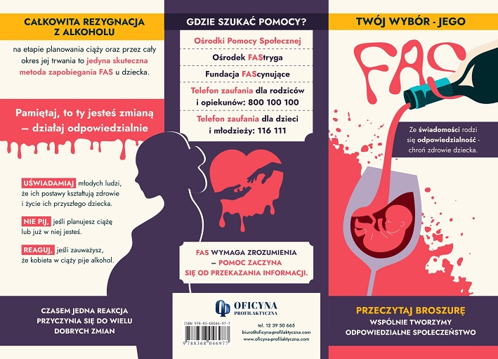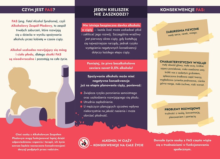 Broszura ma na celu zwiększenie świadomości społecznej na temat Płodowego Zespołu Alkoholowego, czyli FAS (skrót od ang. Fetal Alcohol Syndrome). Materiał w przystępny sposób wyjaśnia, jakie skutki niesie ze sobą spożywanie alkoholu w czasie ciąży