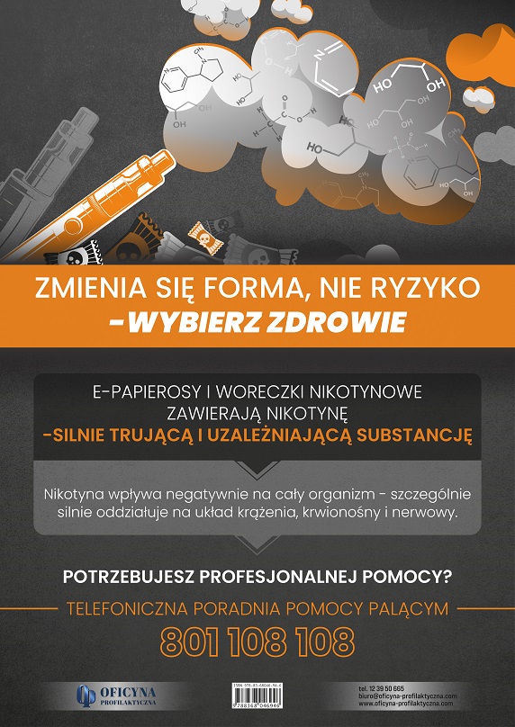 Elektroniczne papierosy i woreczki nikotynowe zyskują coraz większą popularność ze względu na atrakcyjną formę podania oraz błędne przekonanie o ich mniejszej szkodliwości w porównaniu z papierosami tradycyjnymi. Plakat adresowany do osób dorosłych ma na celu budowanie świadomości dotyczącej szkodliwości nikotyny zawartej w obu produktach. Dzięki graficznej formie przekazu najważniejsze informacje stają się łatwiejsze w odbiorze i zapamiętywaniu, co sprzyja skuteczniejszej profilaktyce i zwiększa zasięg działań edukacyjnych.